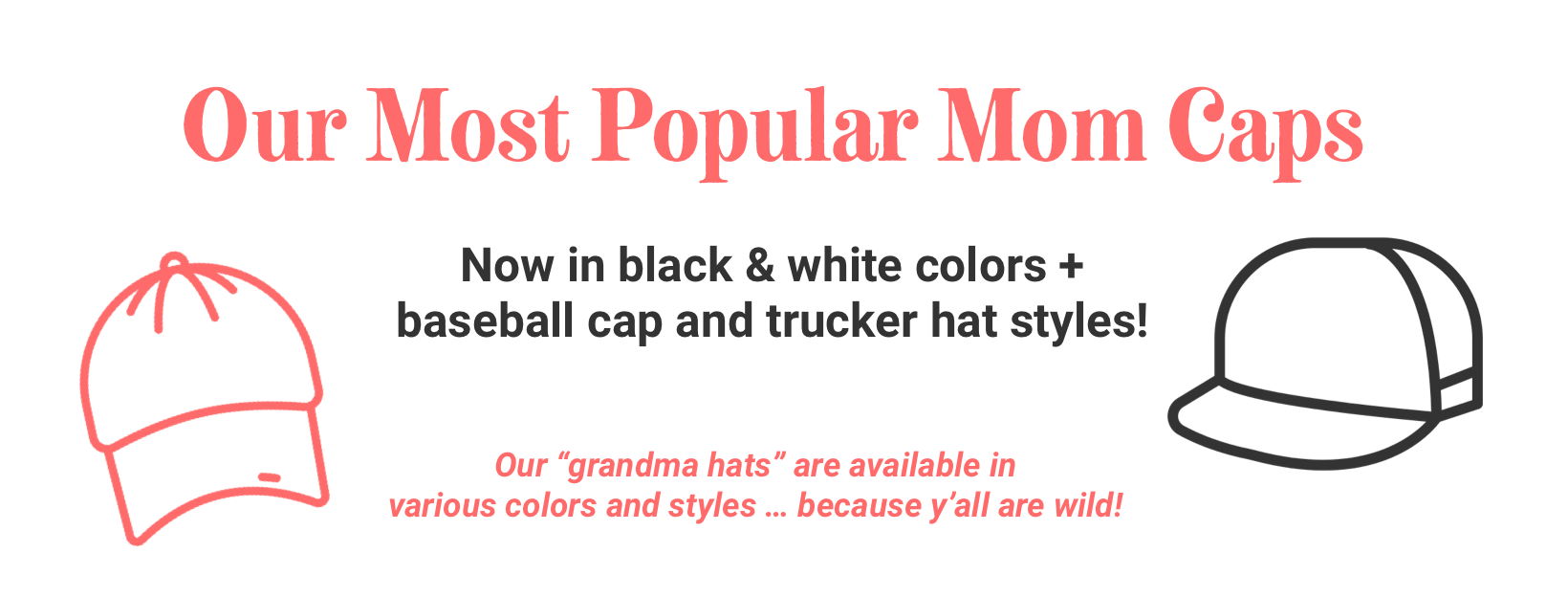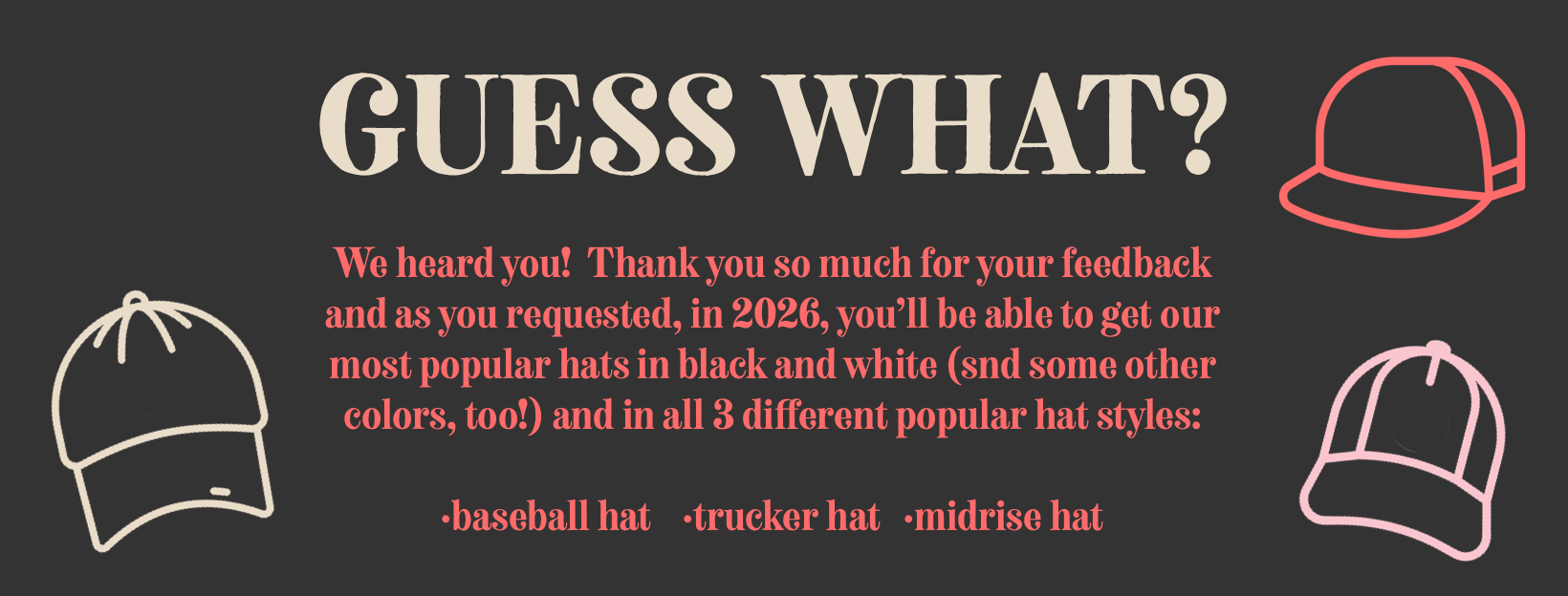 That’s why The Mom Cap Co was born: a collection of hats for all the moms ... all the days ... good hair days, bad hair days, and everything in between. We've got loads of hats for moms (and a few for dad and kids), and anyone who wants to adopt a little hat'tidude! Check back often, we are adding more styles, changing up the color combos and graphics ... just for you fabulous moms!