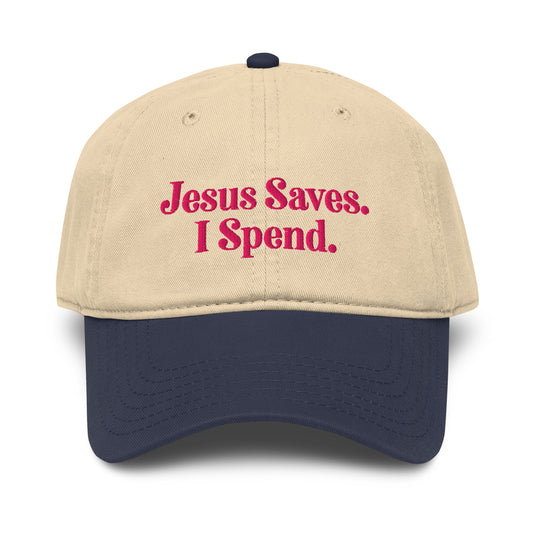 Jesus Saves I Spend Baseball Cap - Canvas, Navy Bill, Hot Pink Embroidery