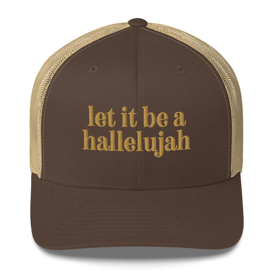 HALLELUJAH Trucker Cap - Brown and Tan Cap, Gold Embroidery